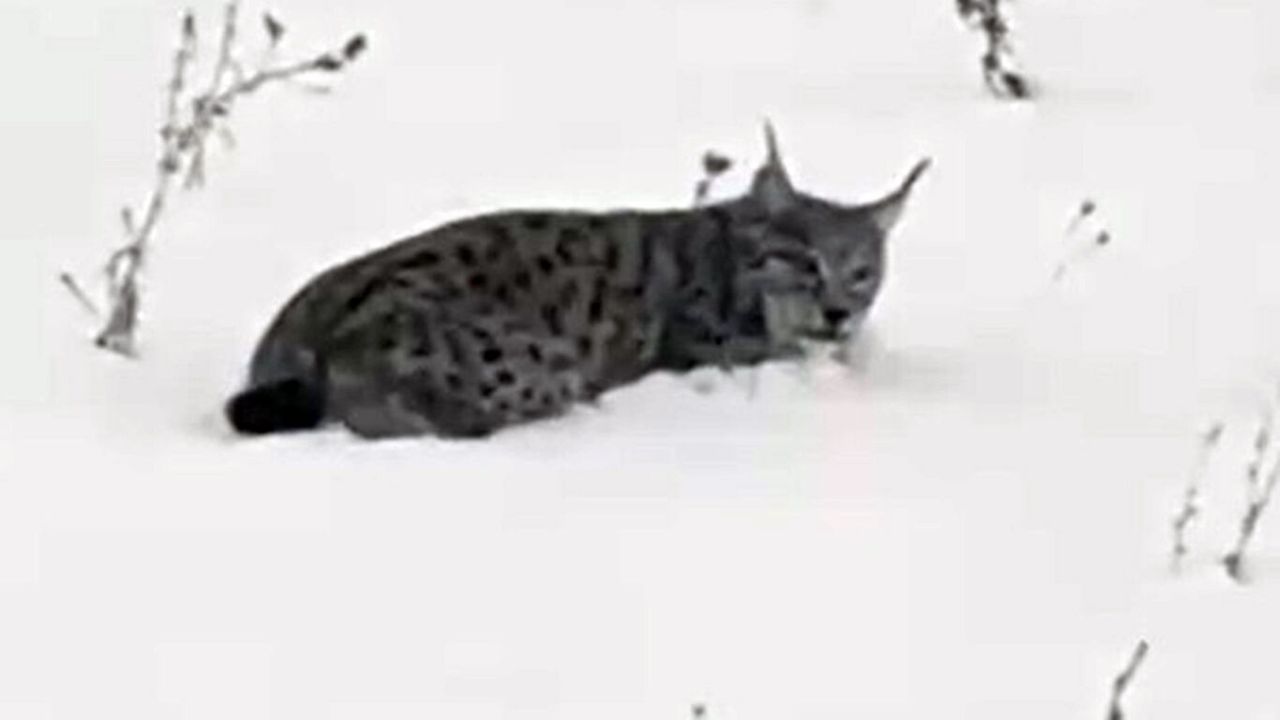 Doğal ortamında nadiren bu kadar yakından izlenebilen vaşak, karlar içinde bir süre dinlendikten sonra gözlerden kayboldu. (İLKHA)