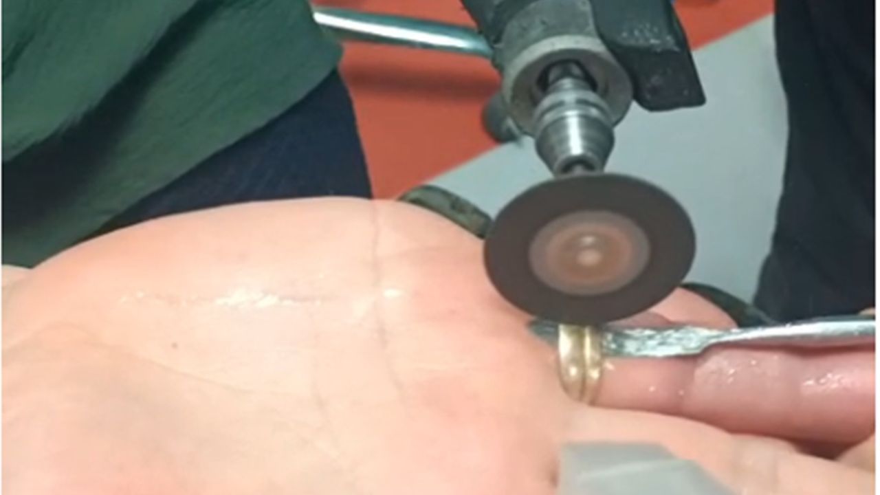 Hastaneye gelen itfaiye ekipleri, doktor kontrolü ve gözetiminde özel ekipman kullanarak sıkışan yüzüğü dikkatli bir şekilde çıkardı.