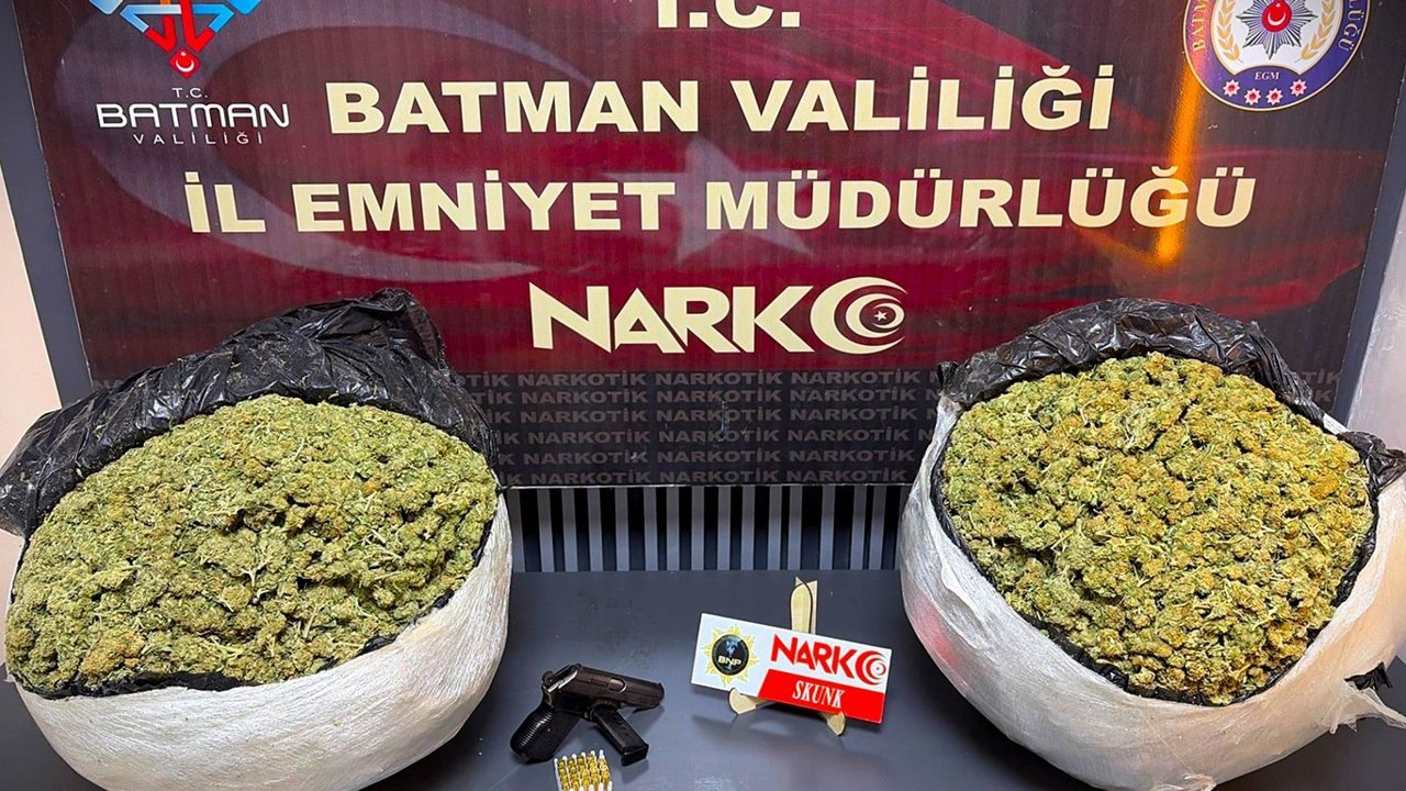 Araçlarda yapılan aramalarda 9 kilo 400 gram skunk maddesi, bir adet 7,65 milimetre çapında ruhsatsız tabanca ve 27 adet fişek bulundu.