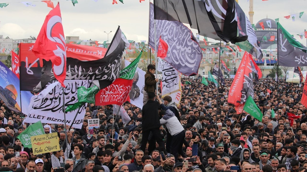 Alanda, üzerinde 'La İlahe İllallah Muhammed Resulullah' yazılı büyük Tevhid bayraklarının yanı sıra Filistin bayrakları da yerini aldı.