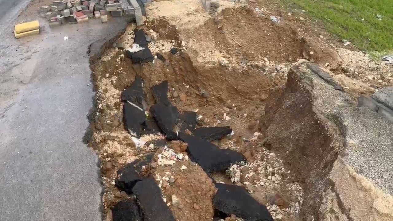 Edinilen bilgilere göre, yağışın ardından zeminin yumuşaması sonucu yolun bir kısmında çukur meydana gelirken, kaldırımda da kısmi hasar oluştu.