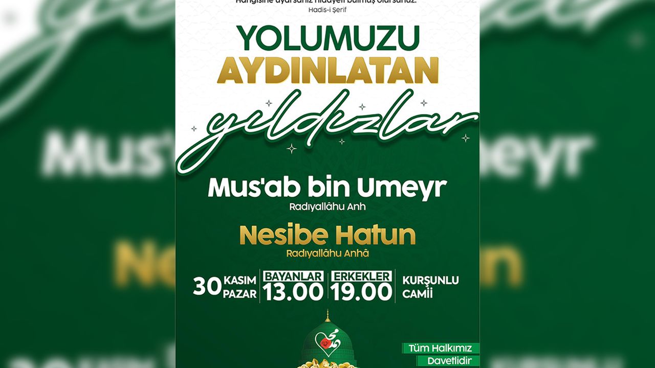 "İçinde yaşadığımız bu çağda özellikle hem gençliğimizde hem de tüm insanlarda gerçekten ciddi bir yozlaşma, dinden uzaklaşma ve dünyevileşme var. Bizler bu dünyevileşme ve yozlaşmadan kurtuluşun yegâne yolunun Peygamber Efendimiz Sallallahu Aleyhi Vesellem ve onun kutlu sahabelerinin yolu ve örnekliğinde kurtulacağımıza inanıyoruz. Bu meyanda pazar günü Kurşunlu Camii'nde saat 13.00'de bayanlara yönelik olarak Nesibe Hatun Radiyallahu Anhume'nin hayatını anlatan, akşam 19.00'da ise erkeklere yönelik Musab Bin Umeyr Radiyallahu Anhume'nin hayatını anlatan program düzenlenecek."