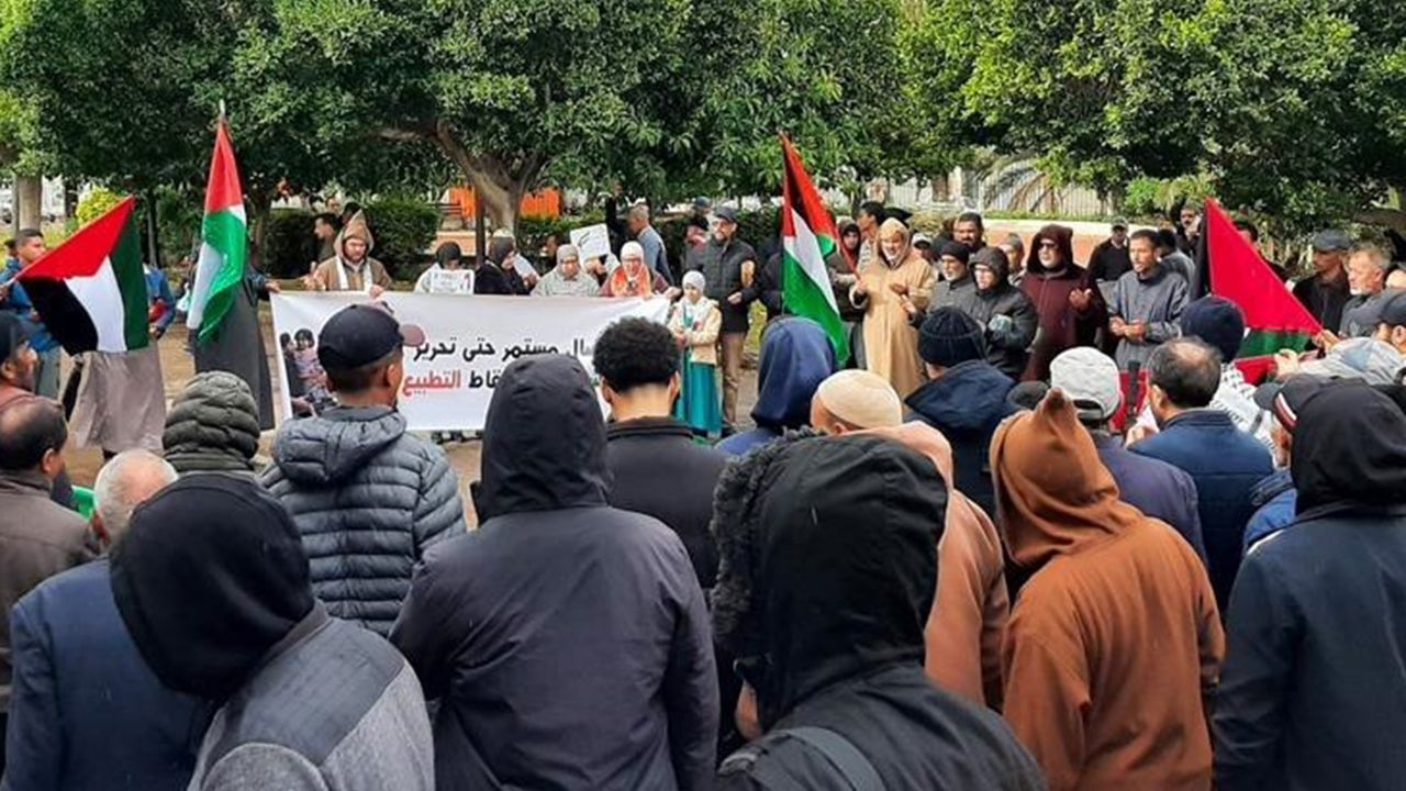 Fas'ın kuzeyindeki Tanca şehri, pazar gecesi Filistin ve Sudan halklarıyla dayanışma amacıyla düzenlenen kitlesel eyleme sahne oldu.