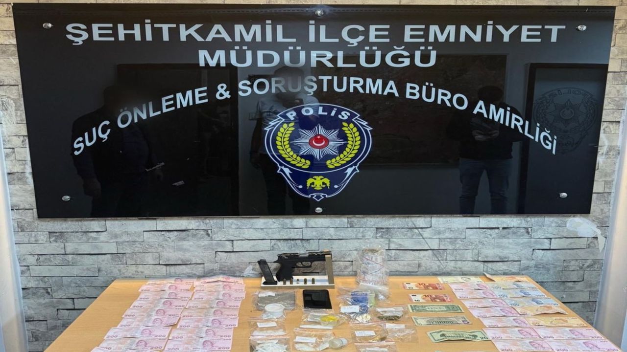 Şehitkamil İlçe Emniyet Müdürlüğü ekipleri tarafından suç ve suç unsurlarının önlenmesine yönelik yürütülen çalışmalar kapsamında yapılan operasyonda; 1 adet ruhsatsız tabanca, 5 adet fişek, bir miktar uyuşturucu madde, 1 adet hassas terazi ile 6 bin 690 TL, 126 dolar ve 20 euro ele geçirildi.