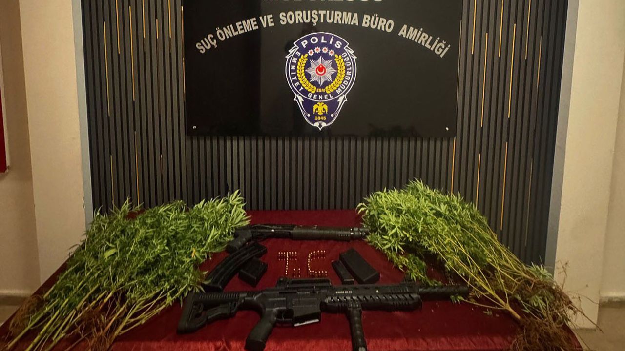 Yapılan aramalarda 16 kök hint keneviri, 2 adet pompalı tüfek, 4 şarjör ve 36 fişek ele geçirildi.