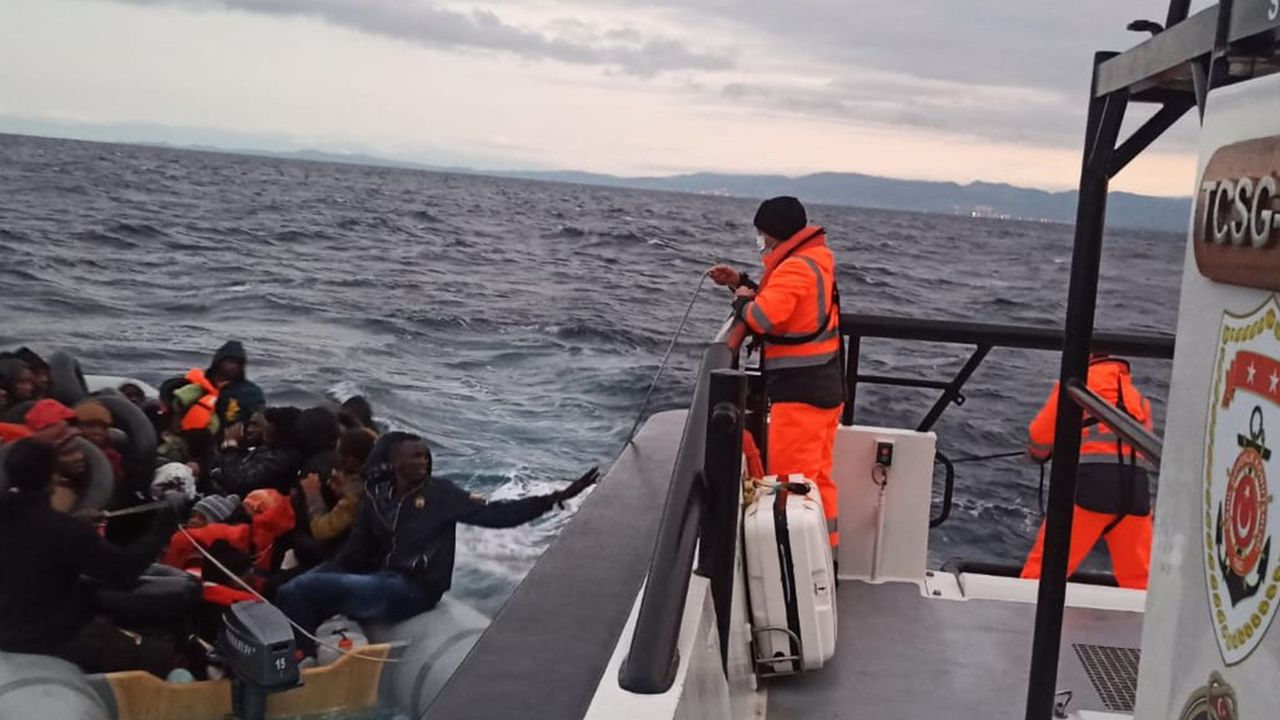 Sahil Güvenlik Komutanlığı ekipleri, Seferihisar açıklarında motor arızası nedeniyle sürüklenen lastik bottaki 13'ü çocuk 33 düzensiz göçmeni kurtardı.