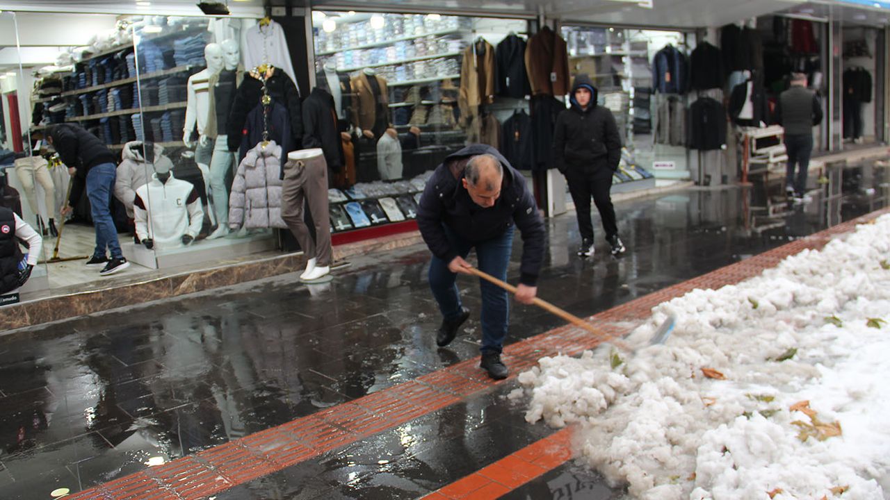 Karın kapattığı dükkanlarının önünü temizleyen esnaf, kar nedeniyle alışverişe çıkmayan müşteri sayısının ciddi oranda düştüğünü, buna karşın kira ve diğer giderlerin devam ettiğini ifade etti.