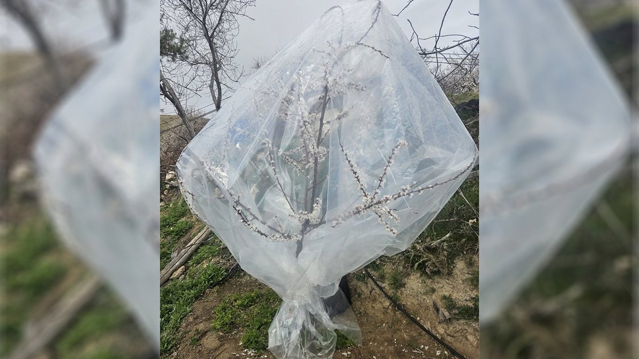 Hava sıcaklıklarının düşmesiyle birlikte zirai don riskinin artması üzerine bazı üreticiler ağaçları naylonla sararak koruma altına aldı.