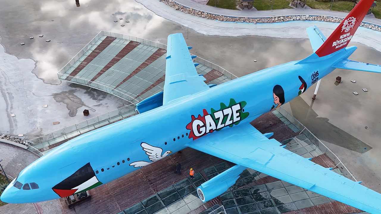 Konya Büyükşehir Belediyesi, Gazze’de yaşanan katliam ve insanlık dramına dikkat çekmek amacıyla Ankara Yolu üzerindeki Türk Yıldızları Parkı’nda uzun yıllardır sergilenen Airbus A300 tipi uçağını, grafiti sanatıyla baştan aşağı yenileyerek Gazze temalı bir farkındalık eserine dönüştürdü.