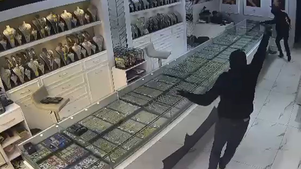 Bir soyguncu vitrindeki altınları sırt çantasına koyarken, diğeri silahla sürekli tehditlerde bulunuyor ve çevreyi gözetlemek için içeriyi ve dışarıyı kontrol ediyor.