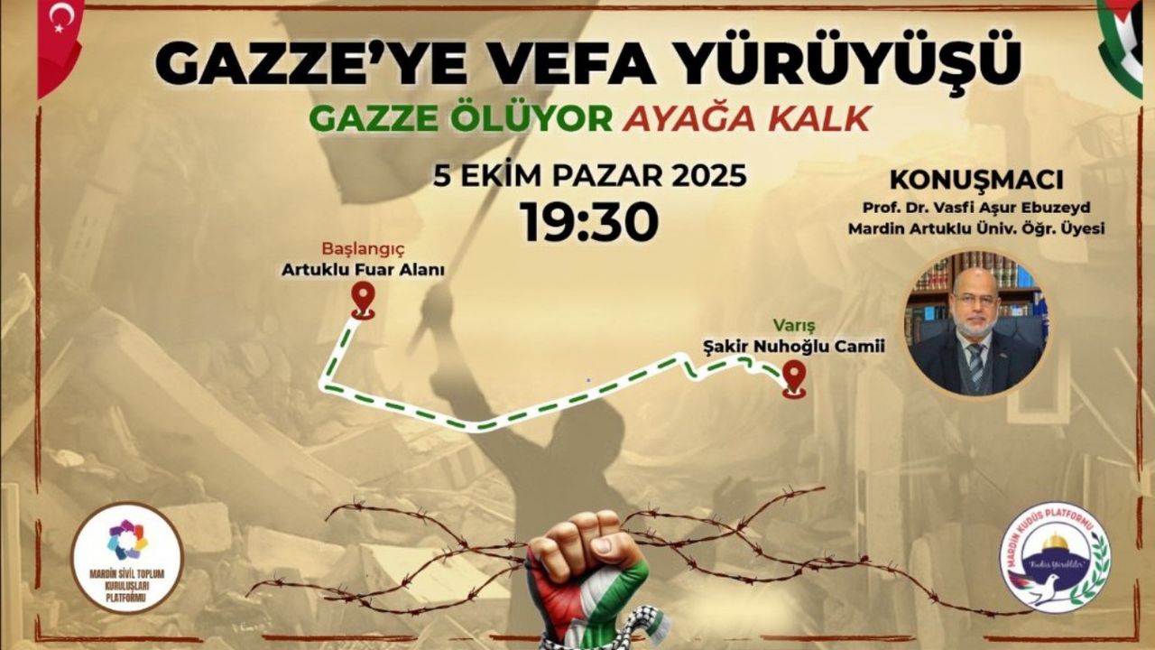 Mardin’deki Sivil Toplum Kuruluşları tarafından düzenlen "Gazze’ye Vefa Yürüyüşü" etkinliği 5 Ekim Pazar günü yapılacak.
