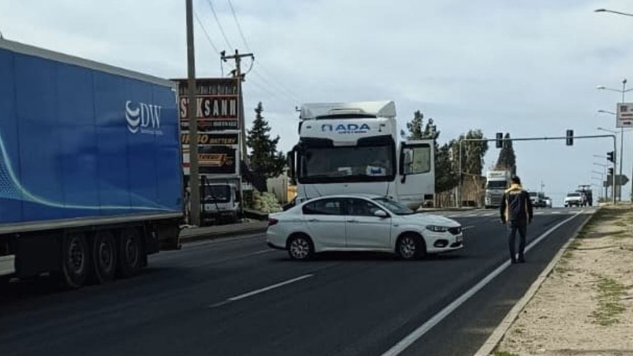 Sürücülerin isim ve plakaları öğrenilemeyen tır, henüz bilinmeyen bir nedenle otomobile çarptı.