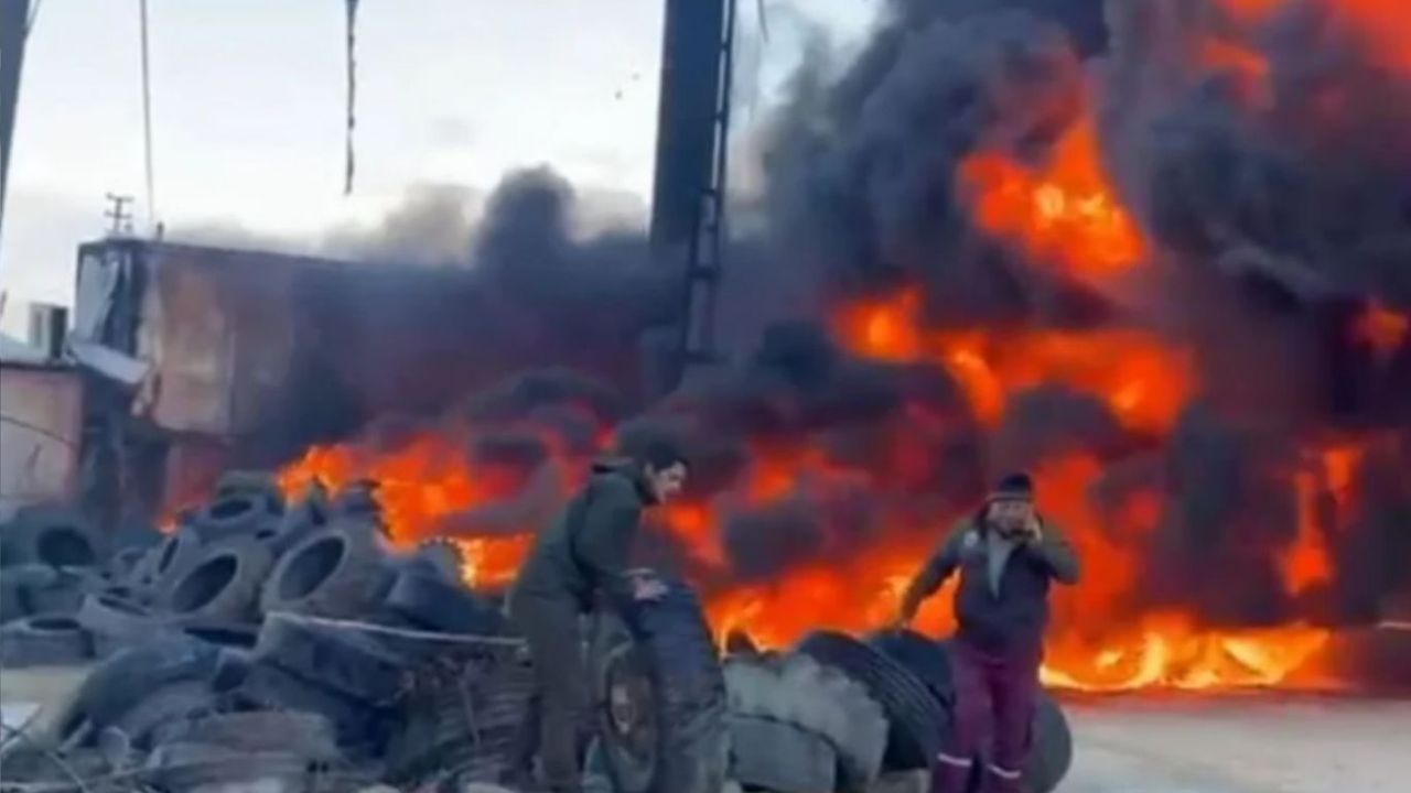 İş yerinde bulunan çok sayıda lastiğin tutuşmasıyla birlikte siyah dumanlar gökyüzünü kapladı.