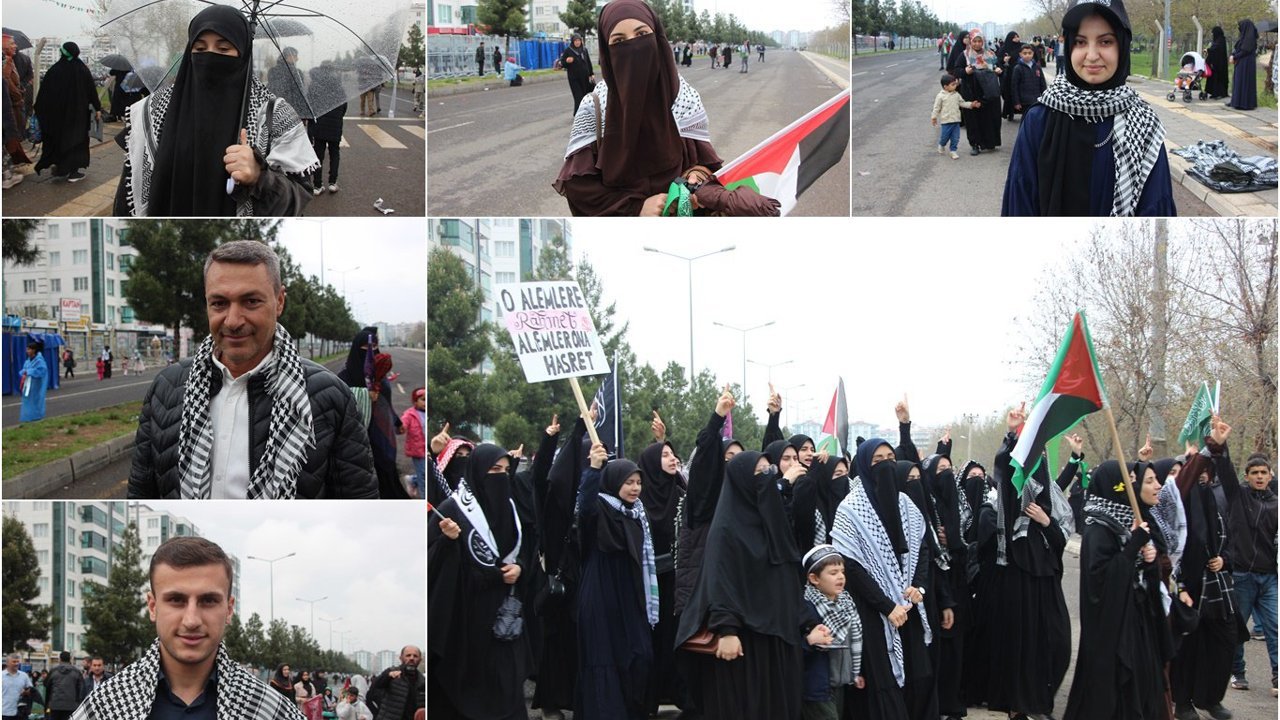Ergani'den Mevlid-i Nebi etkinliğine katılan Hanife Dursun, 'Özellikle Peygamber Efendimiz, Filistin için buraya katıldım. Eğer Peygamberimiz şu an burada olsaydı. O'na orduları hazır bir tek komutanımız eksik diyecektim. Ve buradakilerle Filistin, Gazze'yi savunmaya devam edeceğim.' dedi.