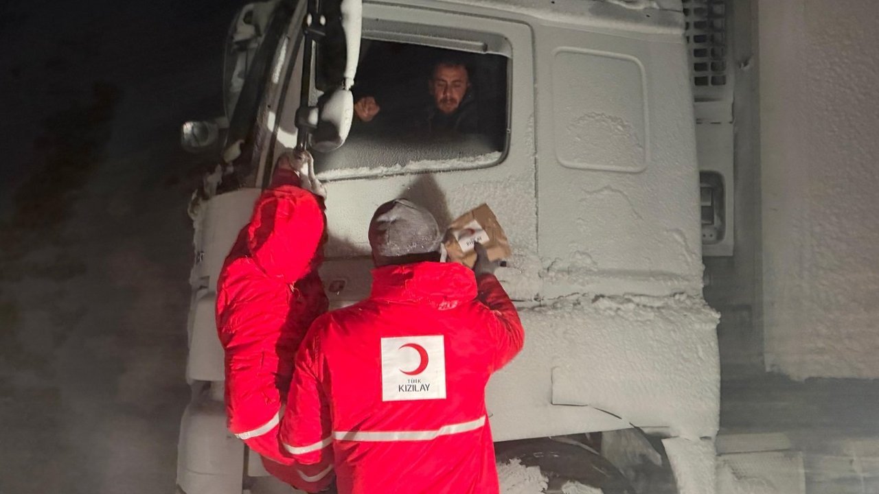 Olumsuz hava koşullarından dolayı yolda kalan ağır tonajlı araçların şoförleri için harekete geçen Kızılay Doğubayazıt Şubesi ekipleri bölgeye giderek yolda kalan sürücülere kumanya desteğinde bulundu.
