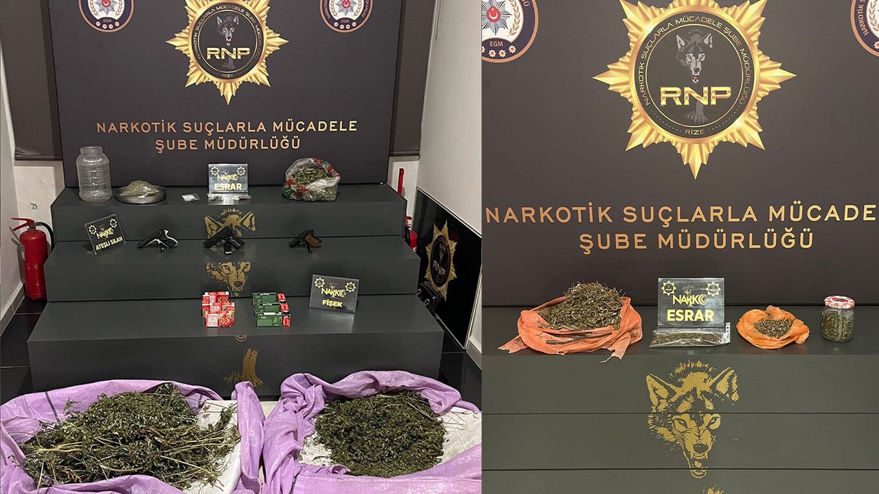 Rize Emniyet Müdürlüğü tarafından yapılan açıklamaya göre, uyuşturucu madde satıcılarına yönelik yürütülen çalışmalar kapsamında gerçekleştirilen operasyonlarda; 2069,70 gram esrar, 192,11 gram sentetik kannabinoid hammaddesi (yaklaşık 19 kilogram üretilebilecek miktarda), 116,83 gram sentetik kannabinoid, 44,23 gram metamfetamin, 2 adet uyuşturucu kullanım aparatı, 3 adet ruhsatsız tabanca ve 464 adet fişek, bir adet kurusıkı tabanca, bir adet ruhsatsız tüfek ile bir adet hassas terazi ele geçirildi.
