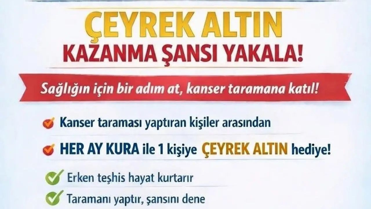 Belirtilen yaş gruplarında yer alarak KETEM’de kanser taramasına katılan vatandaşlar arasından her ay sonunda yapılacak kura çekilişiyle bir kişiye çeyrek altın hediye edilecek. Kampanyaya katılım için herhangi bir ücret ya da ek şart aranmazken, kura sonuçlarının kamuoyuyla ayrıca paylaşılacağı bildirildi.