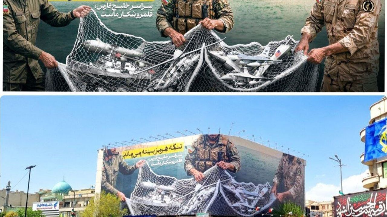 İran İslam Cumhuriyeti'nin başkenti Tahran’daki İnkılap Meydanı’na asılan büyük bir pankart dikkat çekti. Pankartta, İran silahlı kuvvetlerinin düşman hava unsurlarını etkisiz hale getirdiği mesajı verildi. Görselde, askeri personelin bir ağ içerisinde savaş uçakları ve insansız hava araçlarını tuttuğu temsili bir sahne yer aldı.