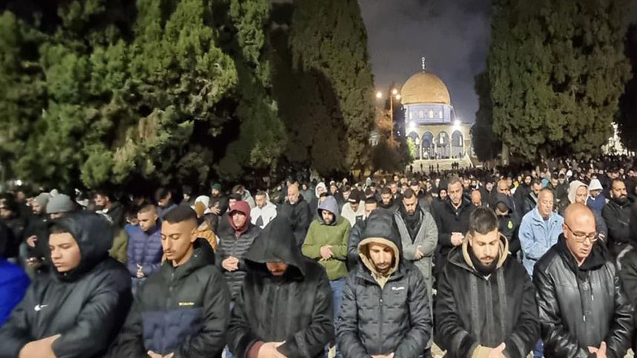 İşgalcilerin tüm engellemelerine ve Kudüs'te artırılan güvenlik kısıtlamalarına rağmen on binlerce Müslüman dün Mescid-i Aksa'da bir araya geldi. Aksa avlularını dolduran cemaat, tekbirler ve dualar eşliğinde saf tuttu.