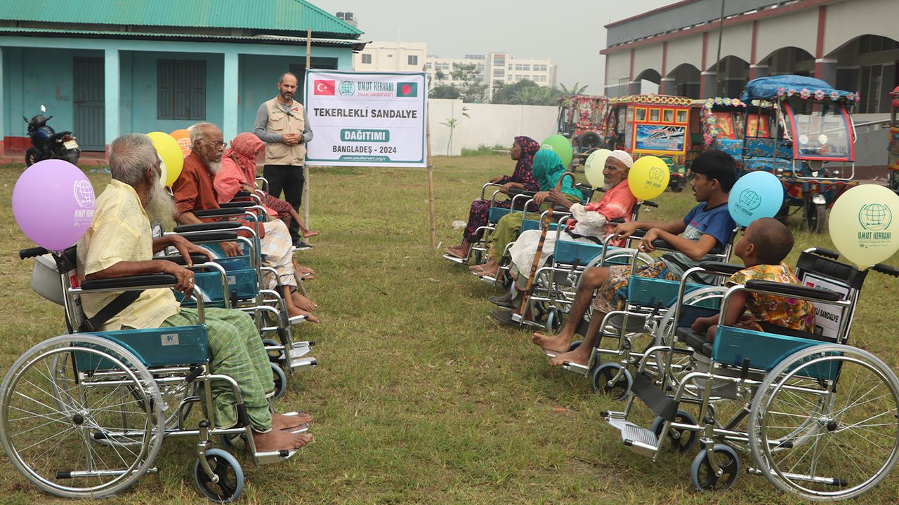 Yaklaşık bir haftadır Bangladeş'te farklı bölgelerde yardım çalışmalarını sürdüren Umut Kervanı ekibi, dikiş makinası dağıtımı, Kur'an-ı Kerim hediyesi ve fidan dikimi ve sıcak yemek ikramının ardından engelli, yaşlı ve yürüyemeyecek durumda olan çok sayıda kişiye tekerlekli sandalye hediye etti.