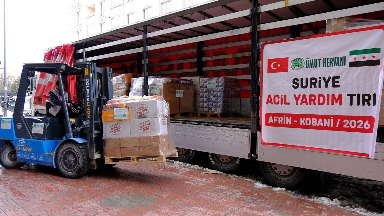 Suriye’deki savaş mağdurlarına destek olmak amacıyla Türkiye’nin birçok ilinde yardım tırları hazırlayan Umut Kervanı, Van’da da hayırseverler aracılığıyla Afrin ve Kobani bölgelerine ulaştırılmak üzere bir tır dolusu insani yardım malzemesi topladı. Dernek binası önünde yüklenen yardım tırı, dualarla yola çıktı.