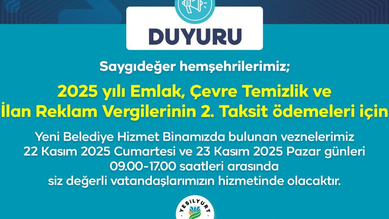 Yeşilyurt Belediyesi Gelirler Müdürlüğü tarafından yapılan çalışma doğrultusunda vergi mükellefleri; emlak vergisi ve iş yerlerine ait çevre temizlik vergisi, ilan reklam vergisi 2025 yılı ikinci taksitlerini Yeşilyurt Belediye Hizmet Binasındaki veznelerinden 22 Kasım Cumartesi günü ile 23 Kasım Pazar günü belirlenen saatleri içerisinde ödeyebilecek.